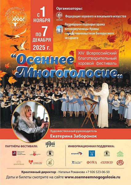 С 1 ноября по 12 декабря 2025 года в Москве проходит XIV Всероссийский благотворительный хоровой фестиваль «Осеннее многоголосие». Фестиваль проводится с 2012 года по благословению Святейшего Патриарха Московского и всея Руси Кирилла и под председательством архиепископа Витебского и Оршанского Димитрия. Организаторами фестиваля выступают Федерация хорового и вокального искусства и Патриаршее подворье храма великомученицы Ирины в Покровском. Фестиваль «Осеннее многоголосие» стал значимым событием в культурной и духовной жизни столицы, внося важный вклад в сохранение нематериального культурного наследия России и укрепление национальной идентичности. Участники фестиваля- лучшие хоровые коллективы России — представляют программу, включающую духовную музыку, народные песни и шедевры мировой и советской классики. Художественный руководитель фестиваля-президент Федерации хорового и вокального искусства, композитор и дирижёр Екатерина Заборонок, отметила, что «Осеннее многоголосие» — это не просто музыкальное событие, а важная культурная инициатива, способствующая укреплению духовных ценностей и единства нации.
