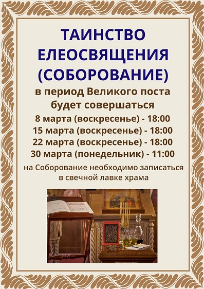 Новости Таинство елеосвящения (соборование) 24.02.2026 24.02.2026 Таинство елеосвящения (соборование) в период Великого поста (9) Поделиться:TelegramВКонтактеОдноклассникиЕлицыEmailБольшеTwitterTumblrRedditМой МирPinterest Масленица в храме Святой равноапостольной Нины в Черемушках Добавить комментарий Отменить ответ Ваш e-mail не будет опубликован. Обязательные поля помечены *КомментарийИмя* Email* Сайт восемь + 7 = Нажмите галочку (защита от спама) Для того, чтобы иметь возможность комментировать, включите JavaScript в Вашем браузере.