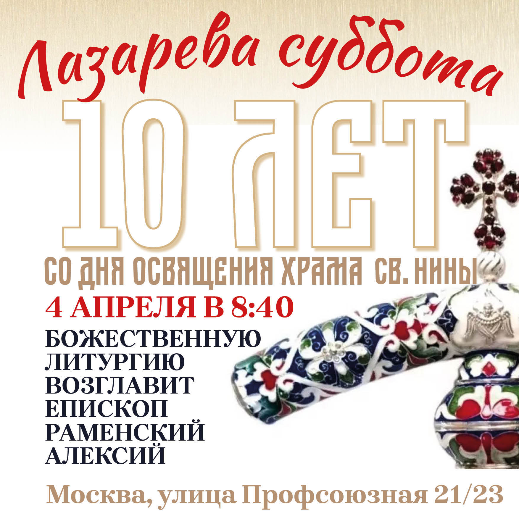 4 апреля в Лазареву субботу начало богослужения в 8:40. Литургию возглавит епископ раменский Алексий.