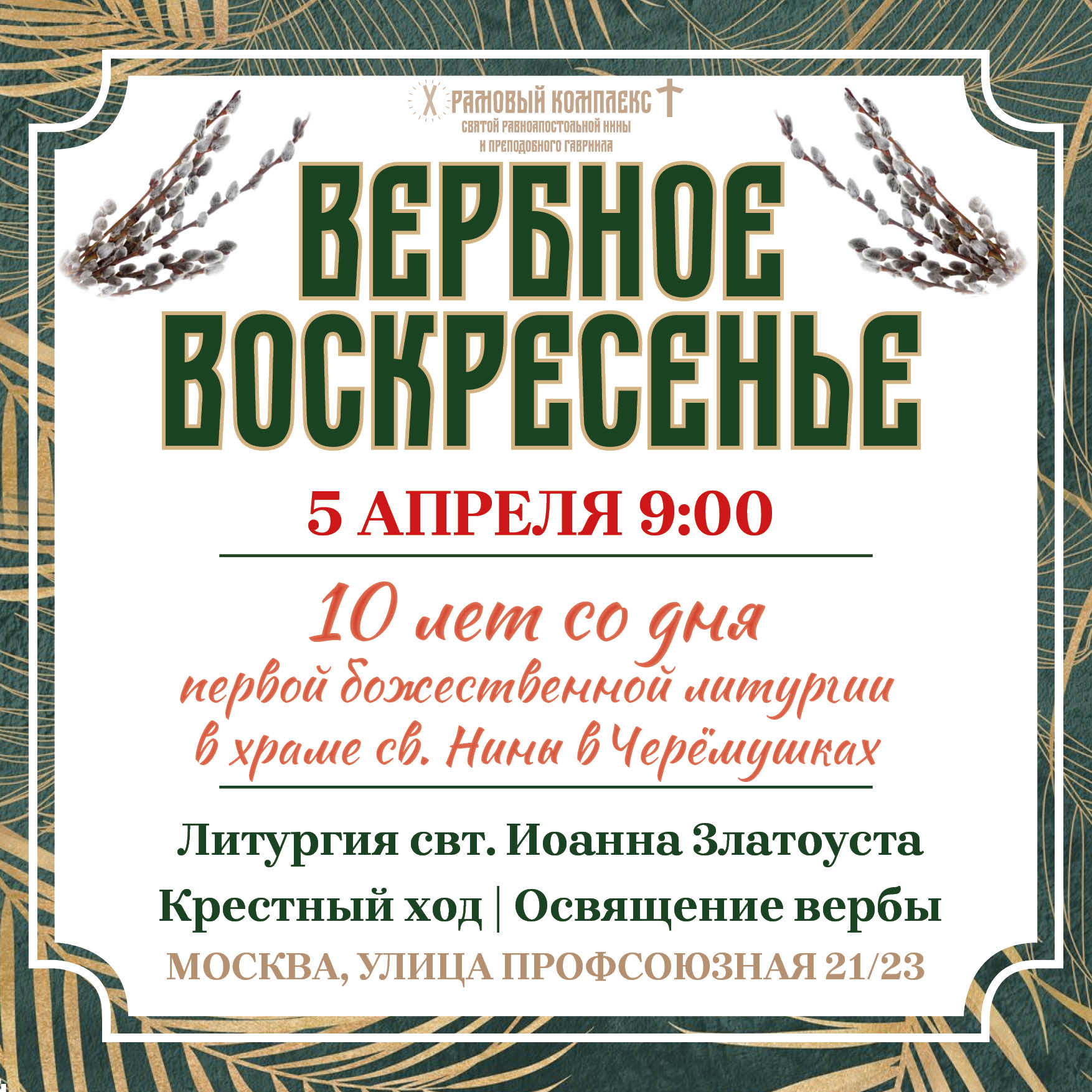 5 апреля в Вербное воскресенье начало Литургии в 9:00. Крестный ход. Освящение верб.